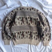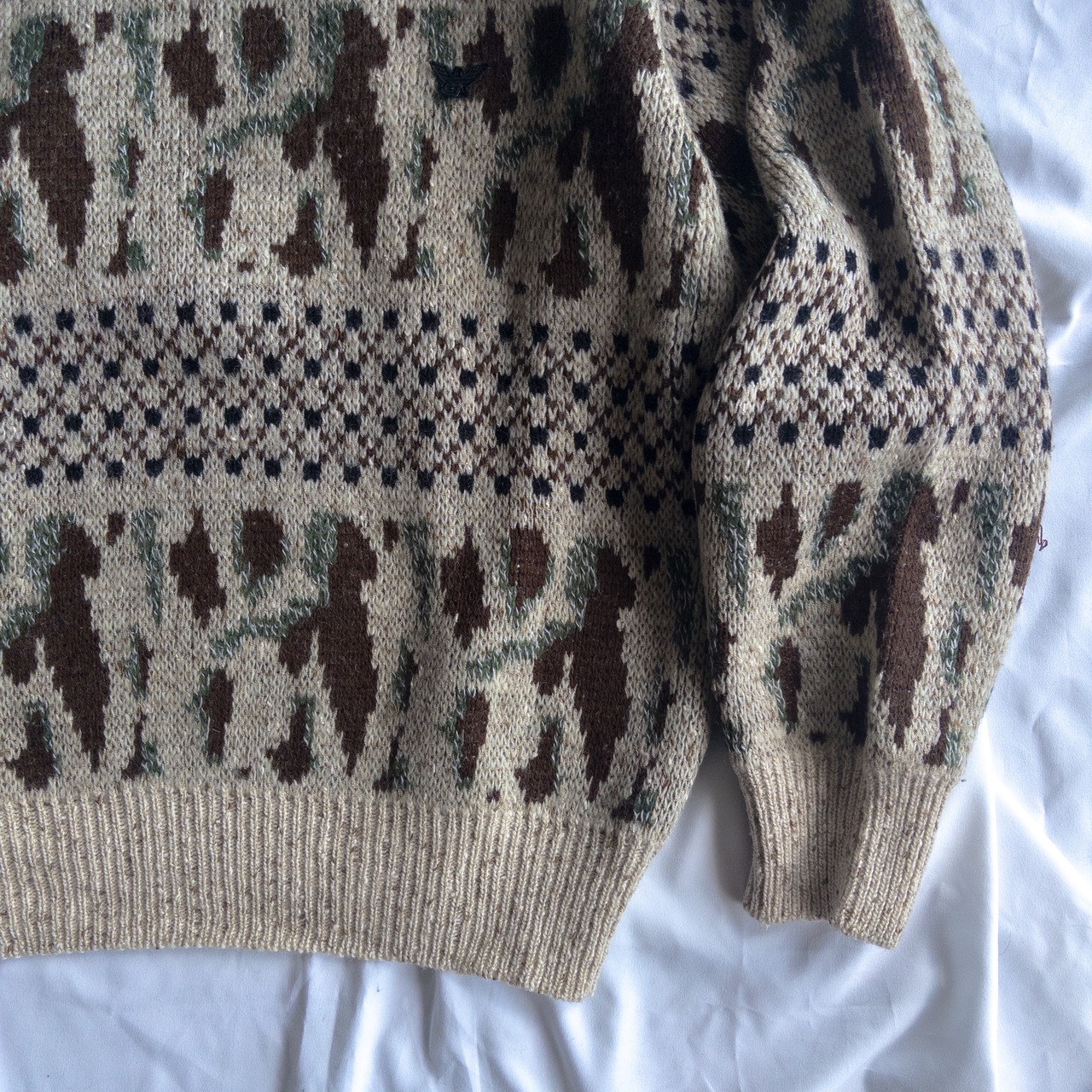 クラシックなフェアアイルのような柄にアブストラクトなカモフラージュパターンのような柄の組み合わせのニットジャンパー