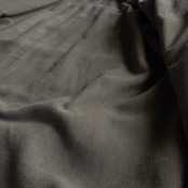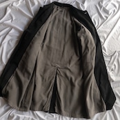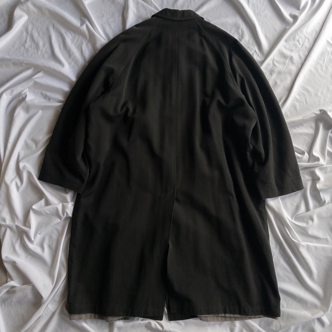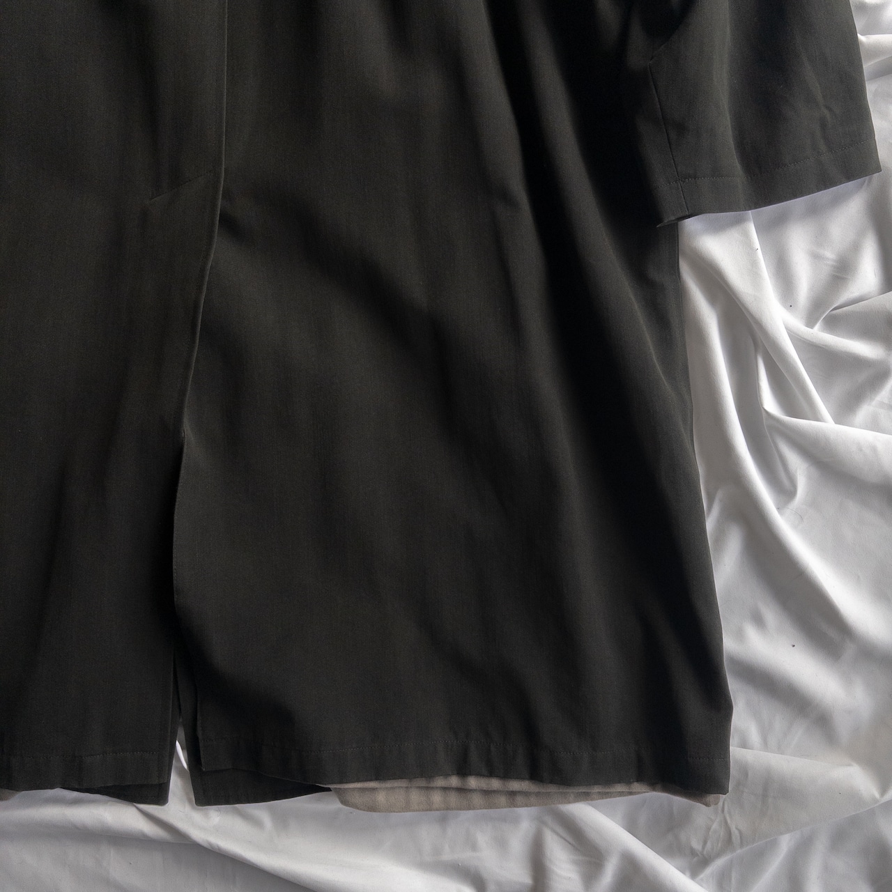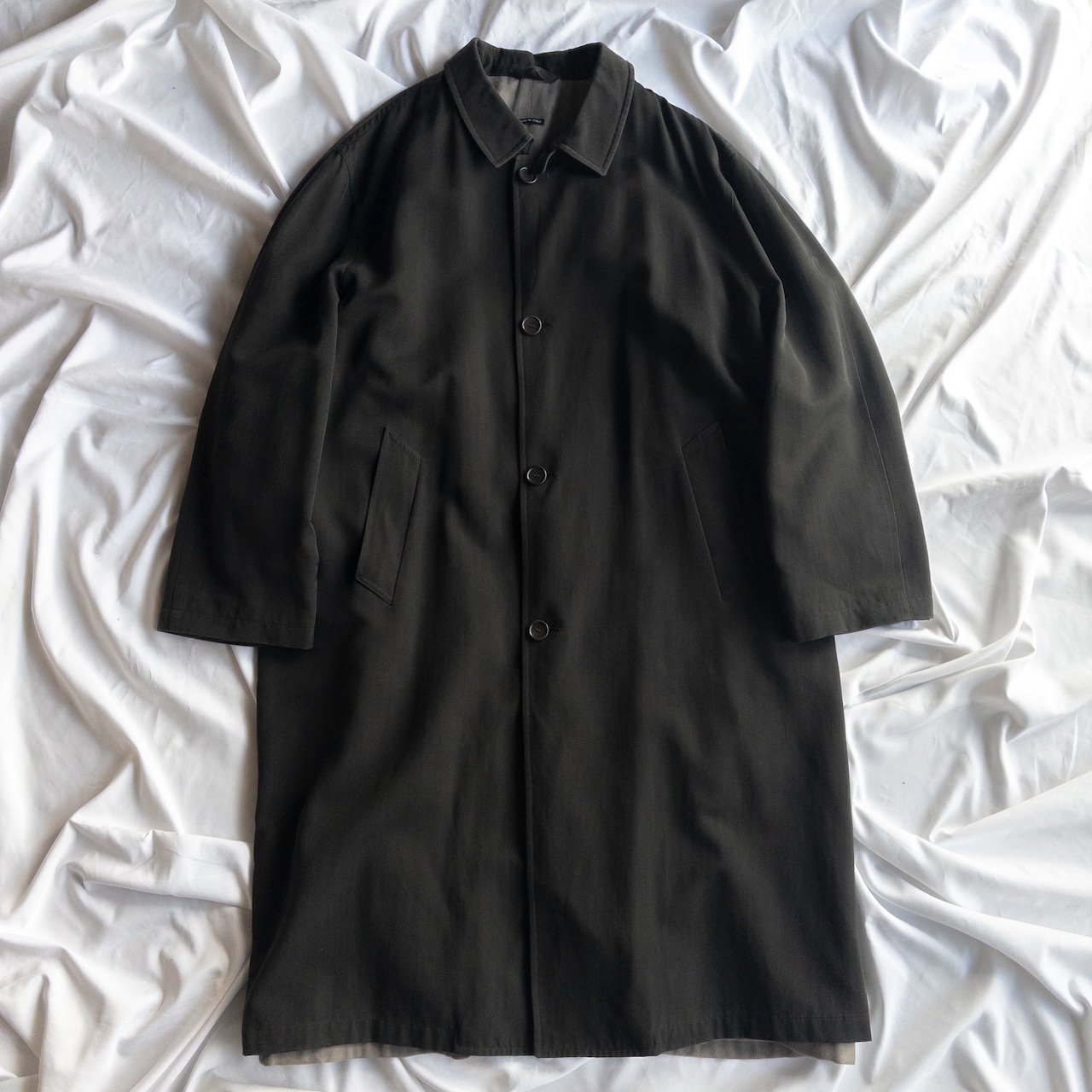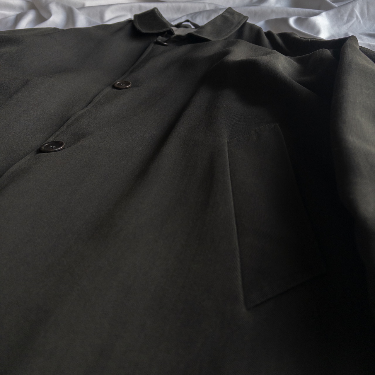 深いダークオリーブカラーのギャバジンコート、生地の重さで下へと流れ落ちていくシルエットが美しい